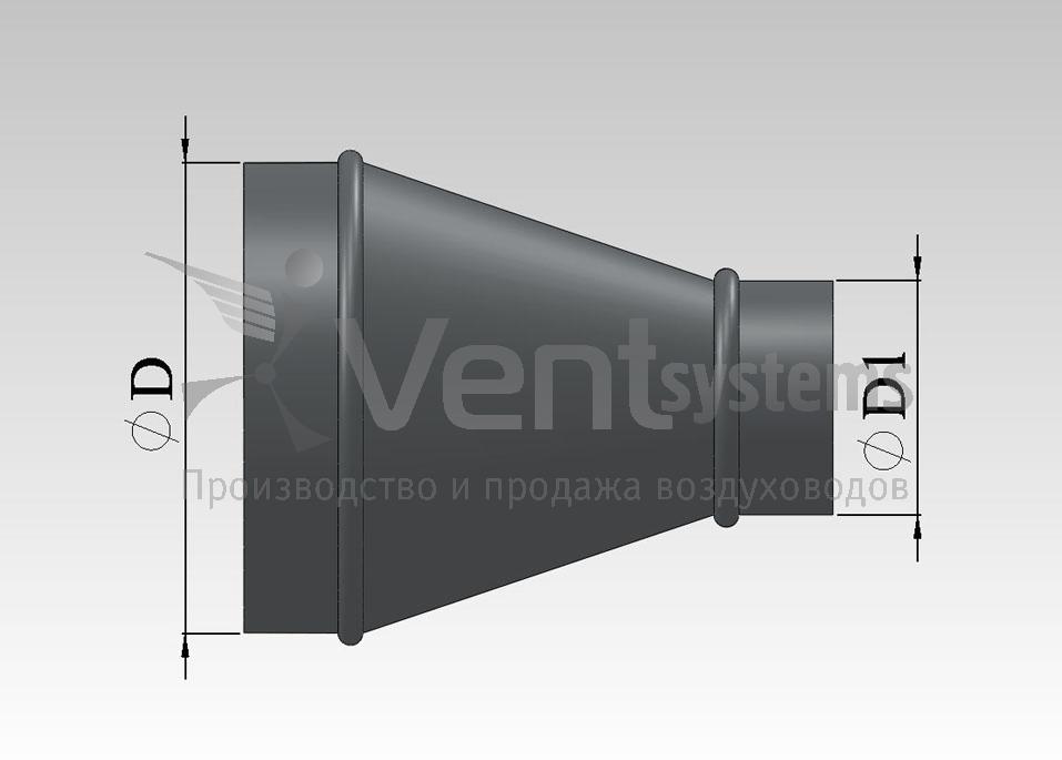 Данный переход стыкует круглые воздуховоды разного диаметра. Смещение является центральным.